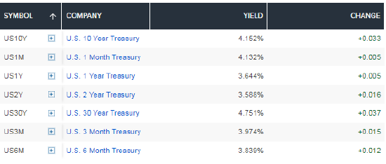 美国 10 年期国债收益率上涨逾 3 个基点,至 4.152%;30 年期国债收益率同样上涨逾 4 个基点,至 4.756%;2 年期国债收益率上涨逾 1 个基点,至 3.586%。