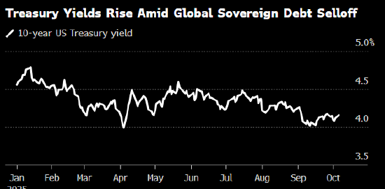 周一,10年期及以上的美债收益率上升超过3个基点,基准10年期国债收益率约为4.15%。全球债市的抛售由日本引领,此前主张财政刺激的保守派高市早苗出人意料地当选自民党党首,势将成为日本下一任首相。而法国总理塞巴斯蒂安·勒科尔尼的辞职令该国陷入新一轮政治危机,法国国债收益率也随之飙升。